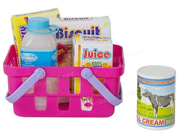 2.A microphone to speak through, dollar bills and coins to purchase the groceries, a conveyor belt to place your items on, a variety of grocery items, and a small basket to place them in.