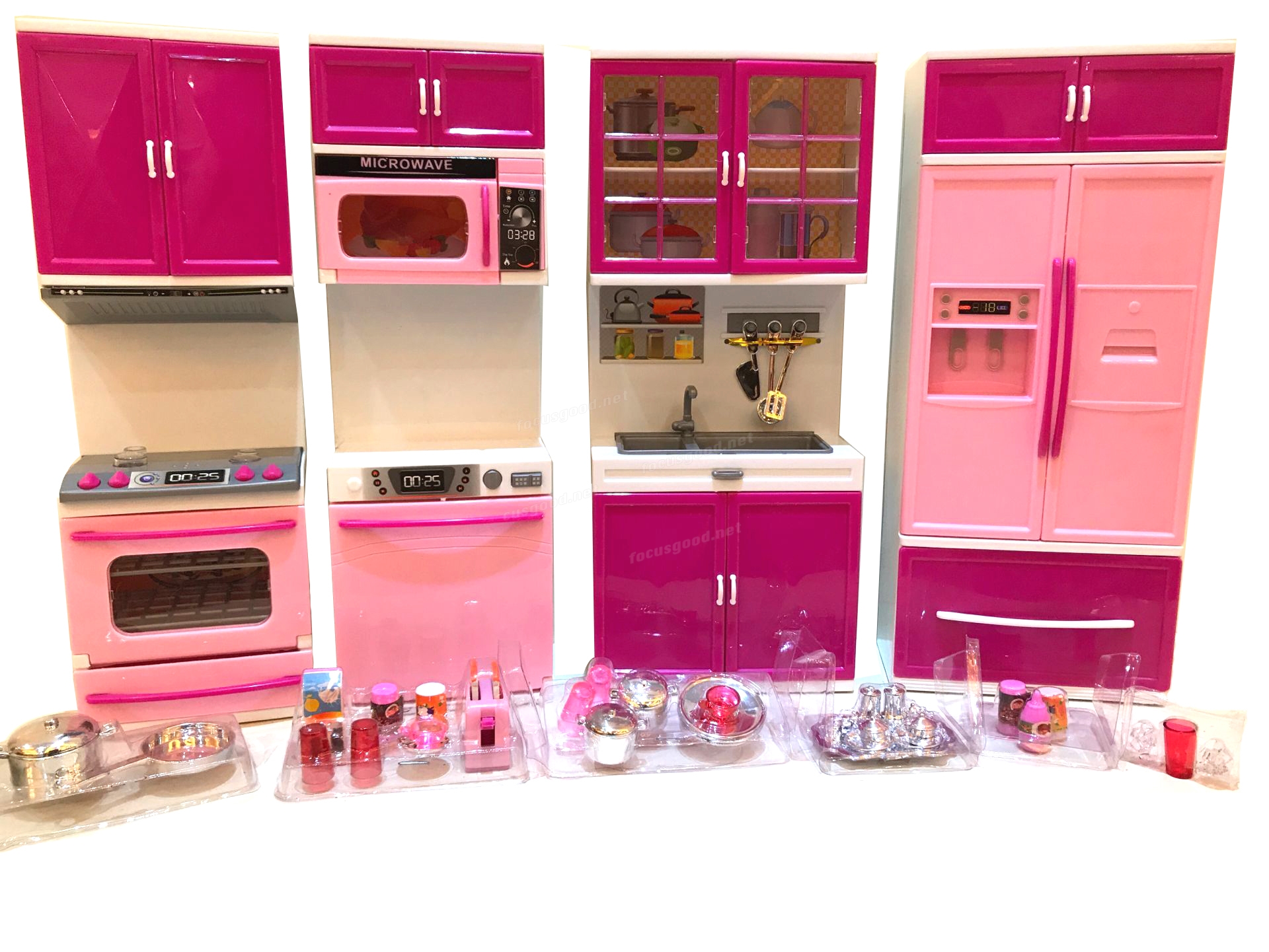 1.All doors & drawers throughout the playset can be opened, stove lights up and makes sound effects.